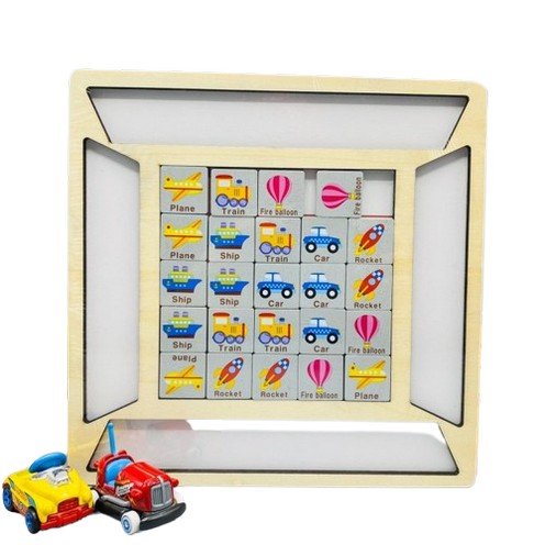 1.Wooden Vehicles Peg Puzzle Toy challenges the player to correctly place puzzle pieces on a 5×5 grid by following illustrated clues that provide all or just some of the information needed.
